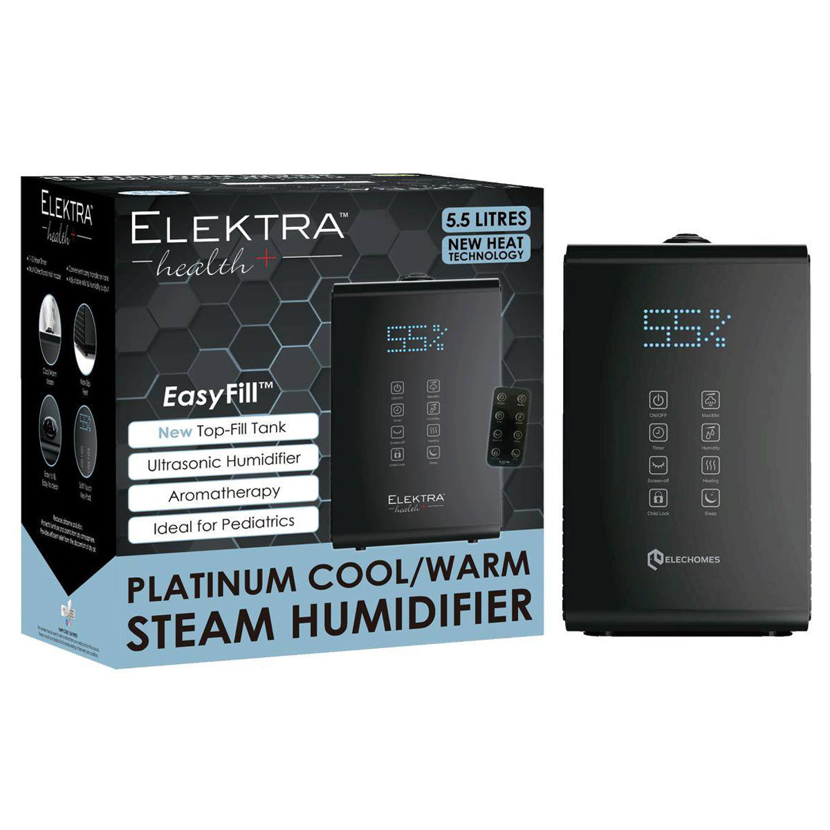 Elektra Platinum Humidifier is an ultrasonic unit that offers both cool and warm mist options, an aromatherapy function, and quiet operation, ideal for home use. It comes with a full-function remote control and has a capacity of either 5.5 or 6 liters depending on the specific model variant