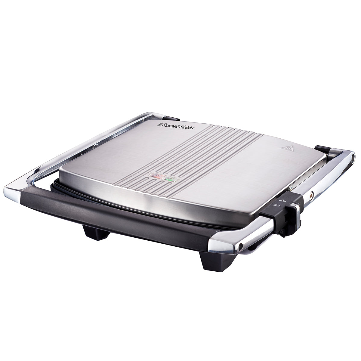 Russell Hobbs Sandwich Press RHSP15 is a versatile 2000W appliance with brushed chrome-plated housing that functions as both a sandwich press and a contact griller, comfortably fitting four sandwiches at once. It features non-stick coated plates and a hinged design that can accommodate a variety of foods, from thick steaks to toasted cheese sandwiches.